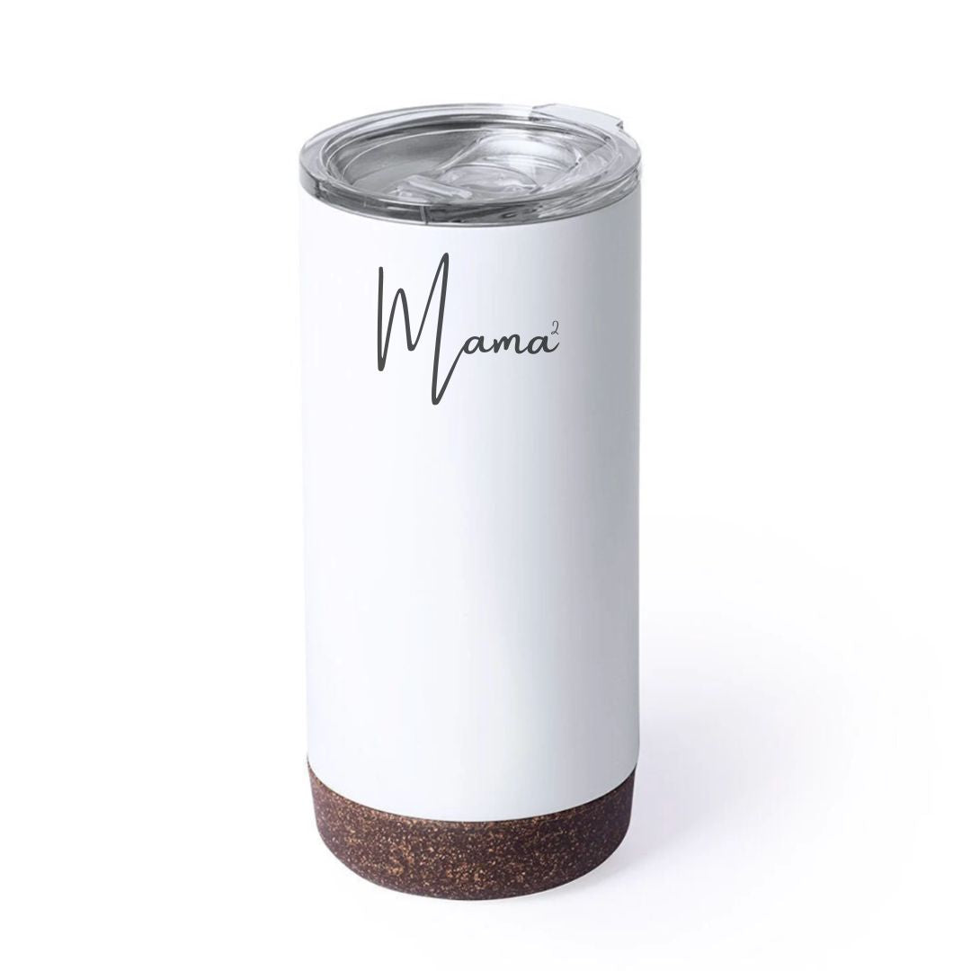 Tumbler de acero inoxidable de doble pared con base de corcho antideslizante y tapa de acrílico con sistema de apertura y cierre.
