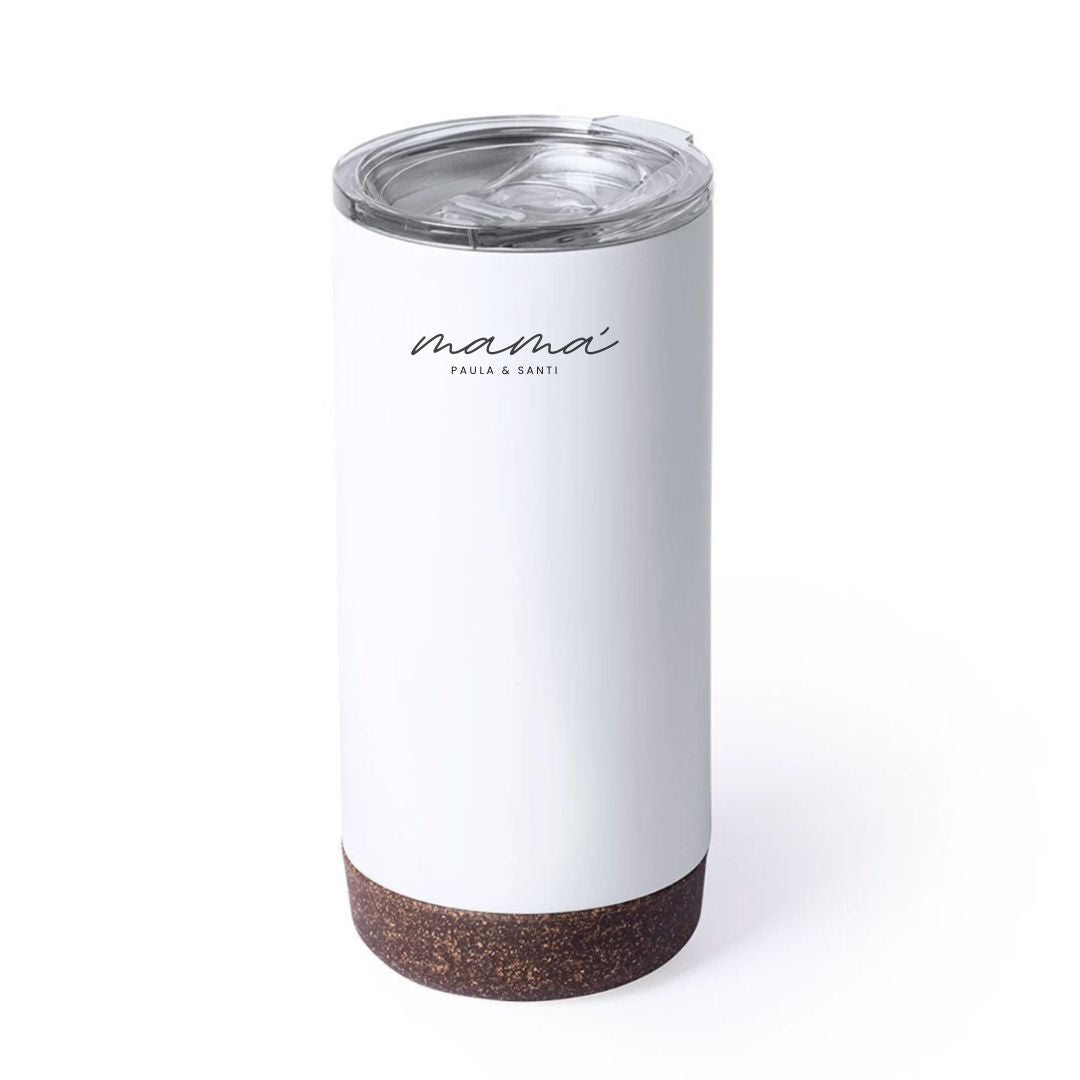 Tumbler de acero inoxidable de doble pared con base de corcho antideslizante y tapa de acrílico con sistema de apertura y cierre.